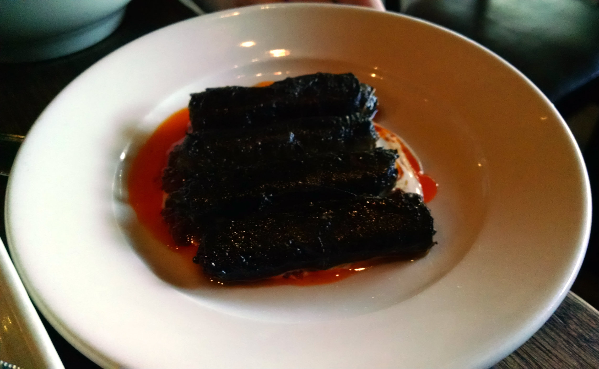 Crispy fried grape leaves with beef and harissa.