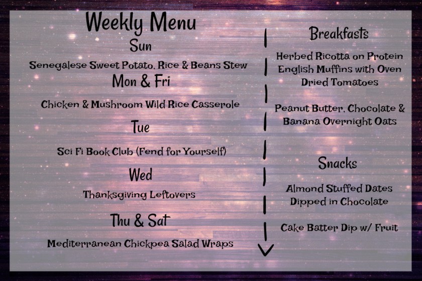 I’m excited about the Chicken & Mushroom Wild Rice Casserole. My friend Rob’s wife, Aurelia, apparently loves Chicken & Rice Casserole, so I’ve been challenge by Rob to make it healthier! I think I have a pretty good recipe, too. The Hubs will be making the Senegalese Sweet Potato, Rice & Beans stew since I’ll be at a Friendsgiving all afternoon. And a friend from high school, Kelly, suggested chickpea salad sandwiches so I switched that up a bit (of course) and am making Mediterranean Chickpea Salad Wraps.