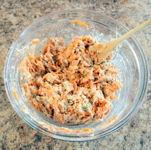 I peeled and grated carrots until I had 1 1/2 cups of shredded carrots. I used my hand grater, which, at the time, felt like way less work than dragging out my food processor and then cleaning it. I was being lazy.